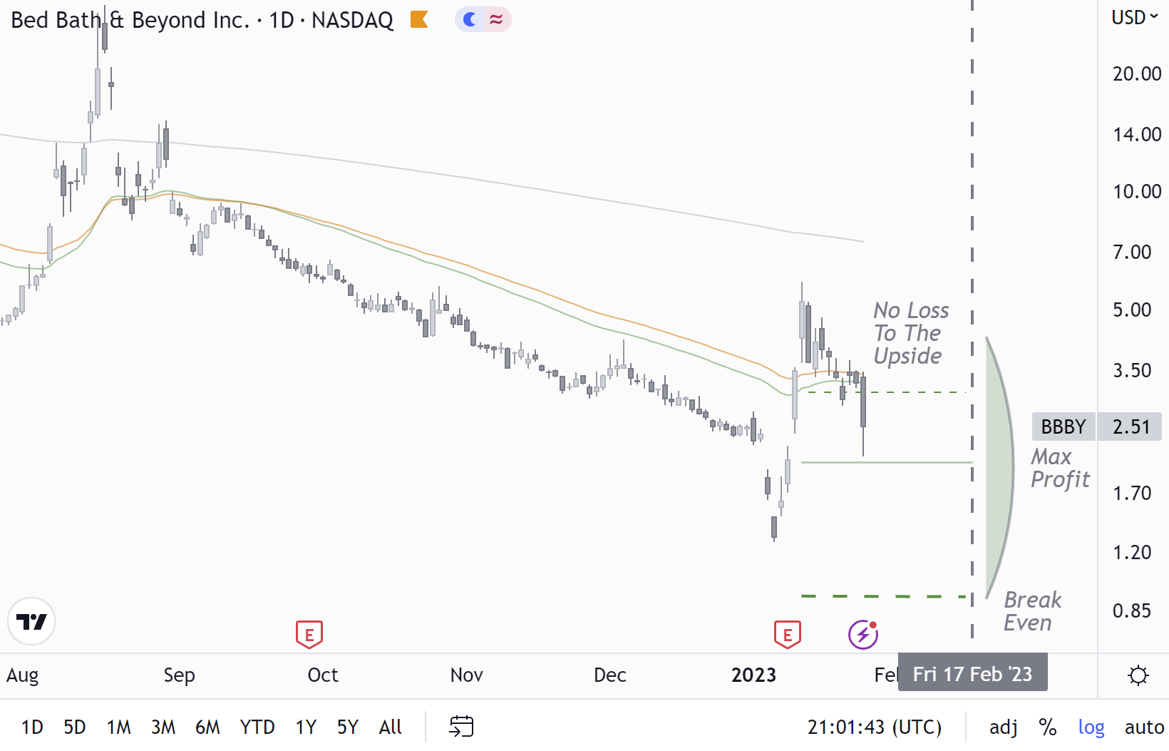 We are not in the gambling business; our strategy is to discover events with high implied volatility that will settle in specific ranges with favorable risk-reward setups. Bed Bath & Beyond, as far as we can fortune-tell, will not settle in any range anytime soon and could very well be settling down close to zero. We're out.