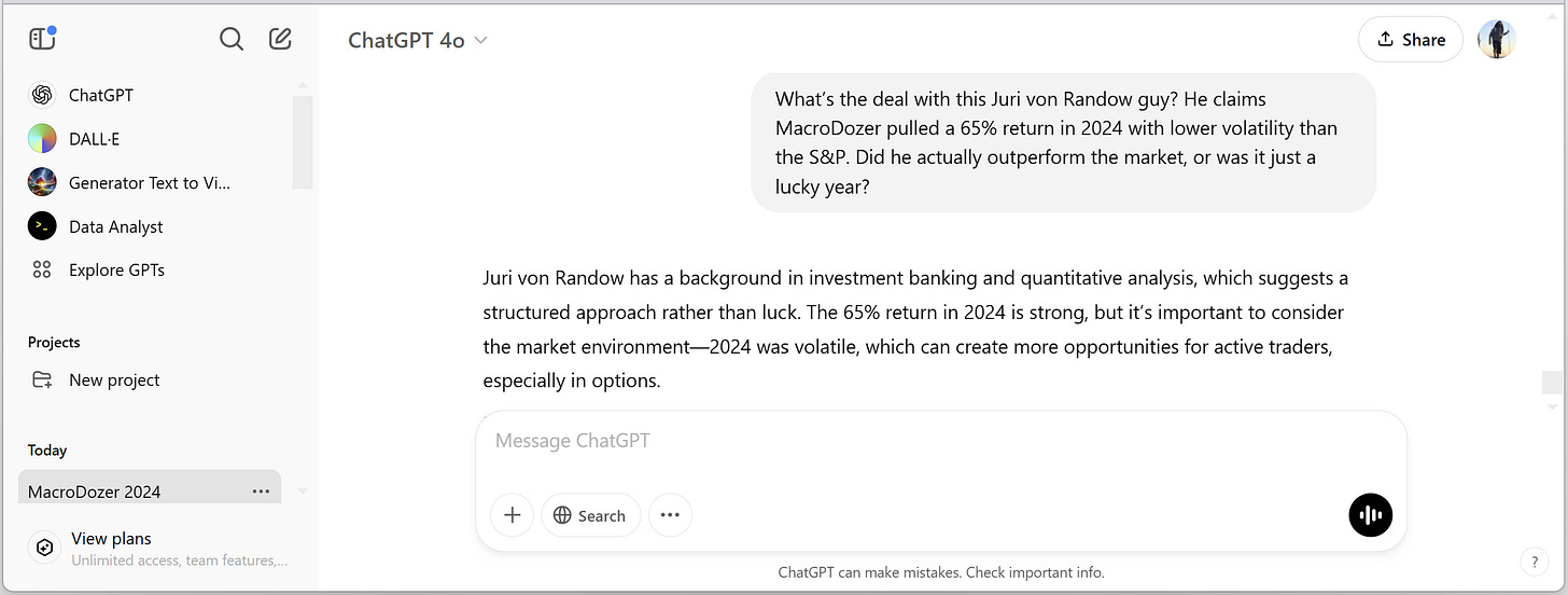 What’s the deal with Juri von Randow? He claims MacroDozer pulled a 65% return in 2024 with lower volatility than the S&P. Did he actually outperform the market, or was it just a lucky year?