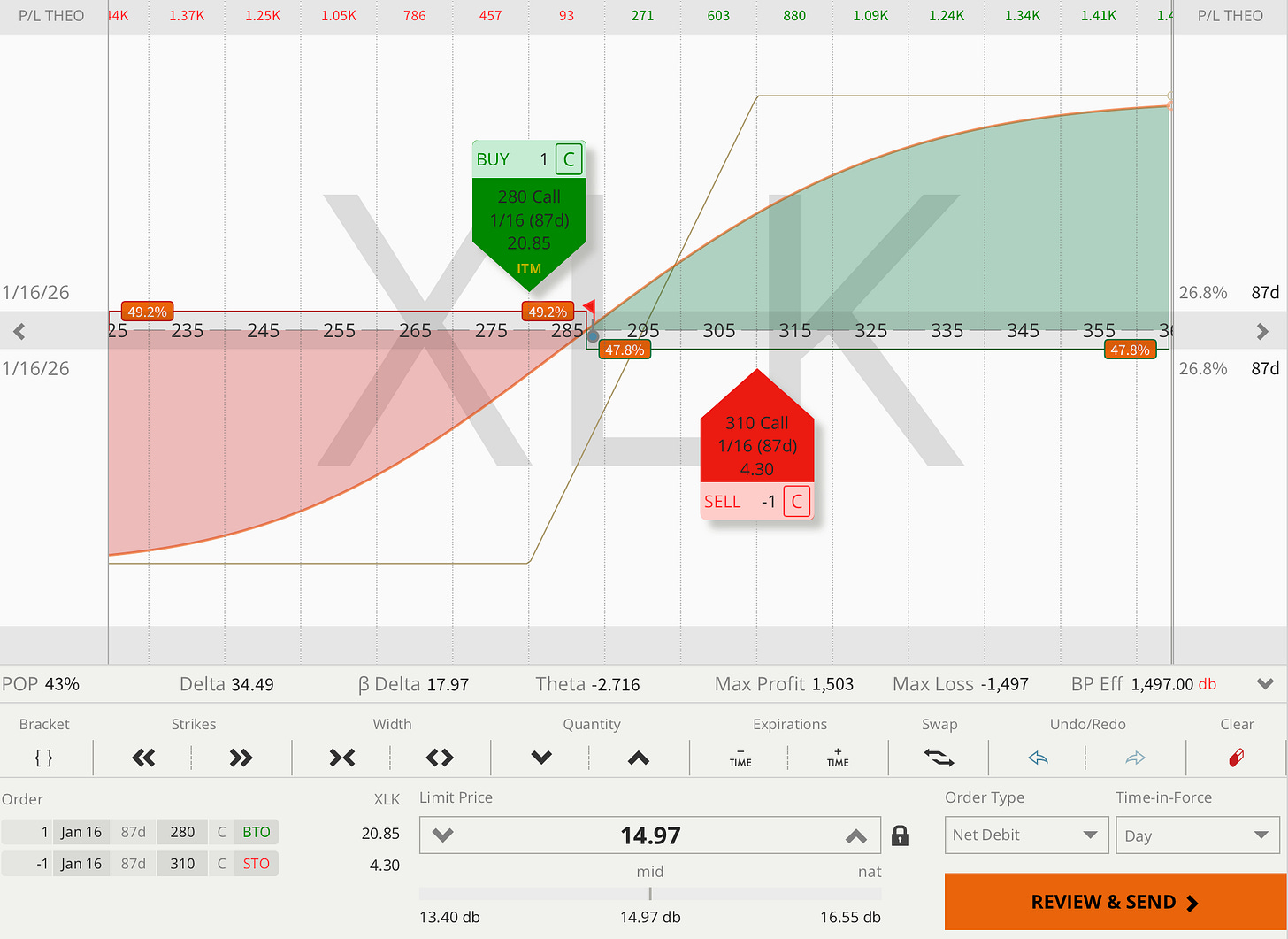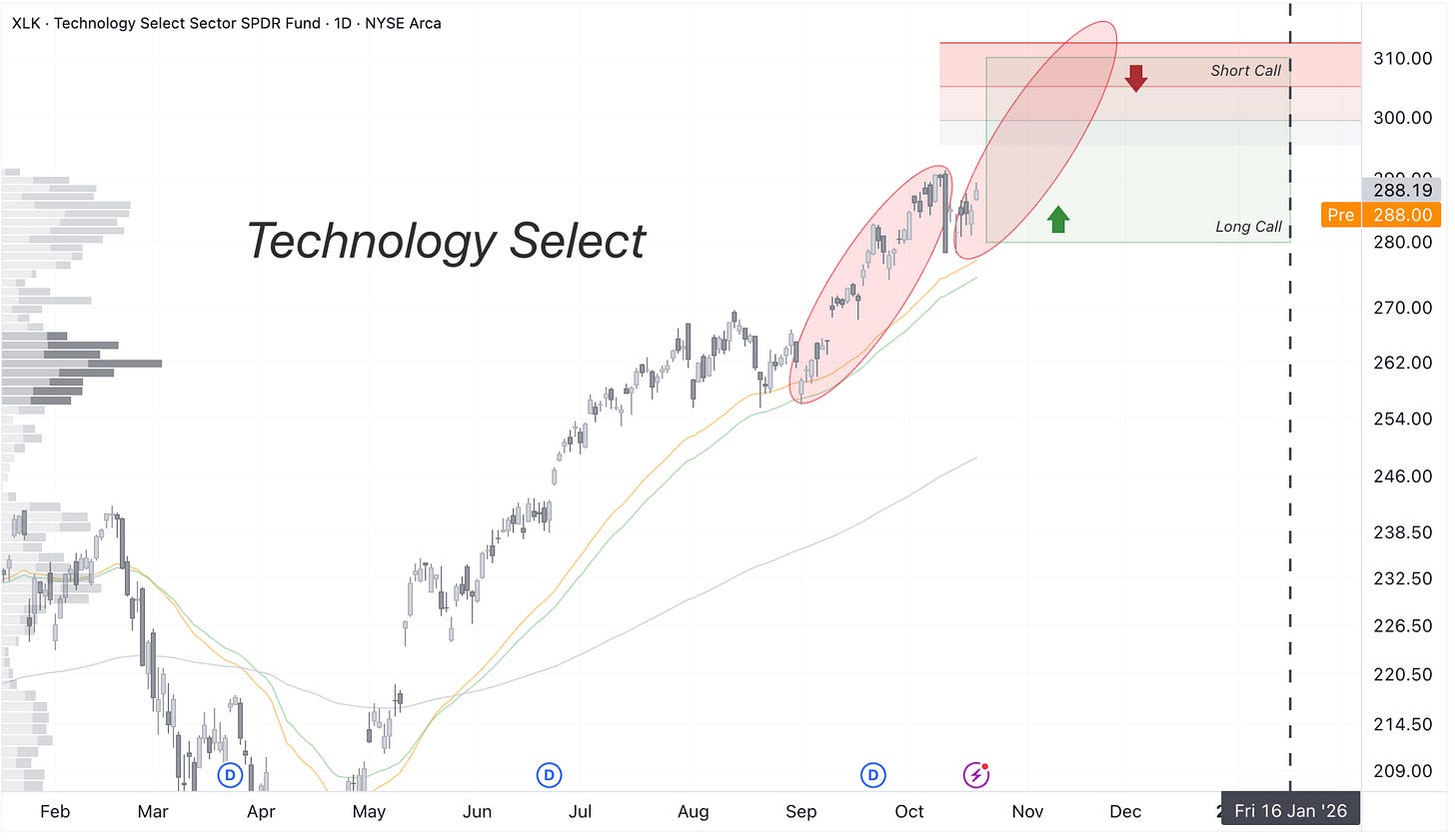 If you see another leg higher into year-end, consider the 280 / 310 January call debit spread. The structure keeps capital efficient while capturing the continuation of the AI-capex and buyback-driven momentum in large-cap tech.